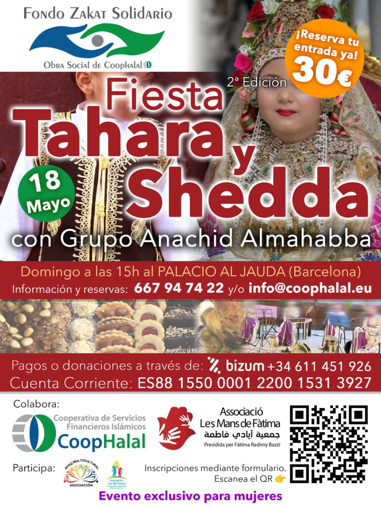 El domingo 18 de mayo, el Fondo Zakat Solidario de CoopHalal celebró la segunda edición de la Fiesta Tahara y Shedda, un encuentro exclusivo para mujeres que puso en valor nuestras tradiciones. La cita, con más de 100 asistentes, tuvo lugar en el Palacio Al Jauda (Barcelona) y contó con la actuación del Grupo Anachid Almahabbah, degustación de dulces típicos y un ambiente alegre y fraterno.